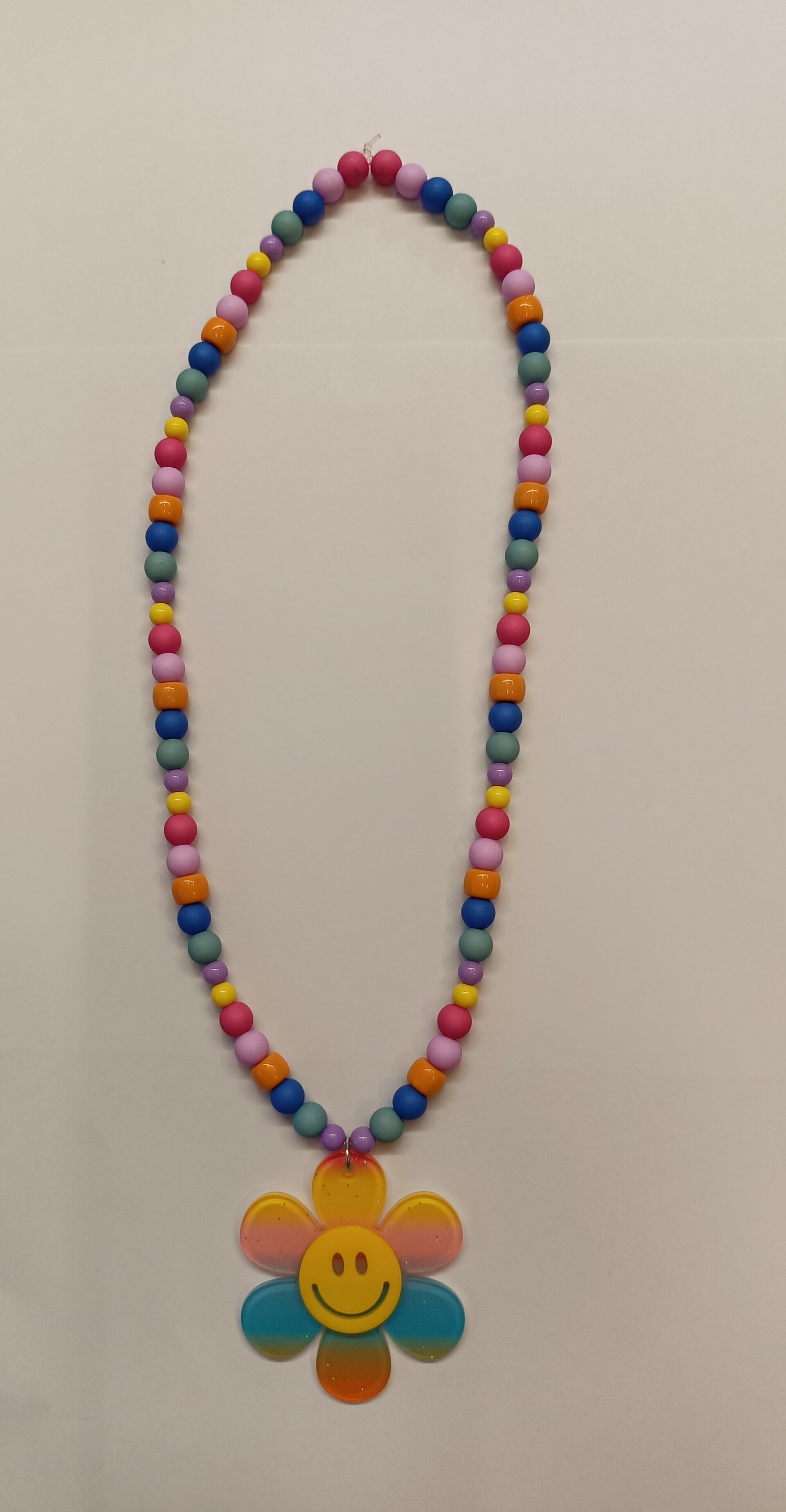 De ketting is met acryl kralen gemaakt en de bedel is van Acryl